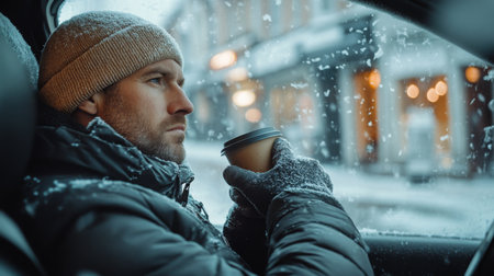 Man enjoying a warm drink while seated in a car during snowfall on a winter day