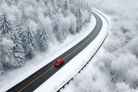Aerial view of red car on the road in winter forest.