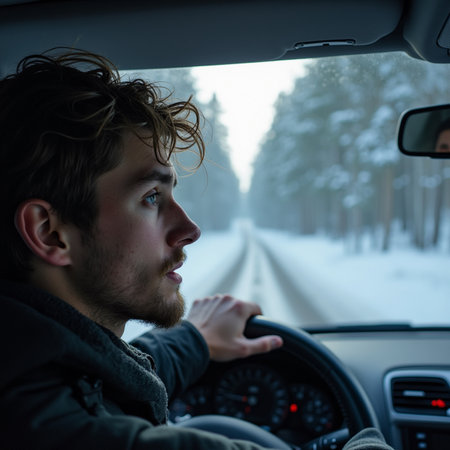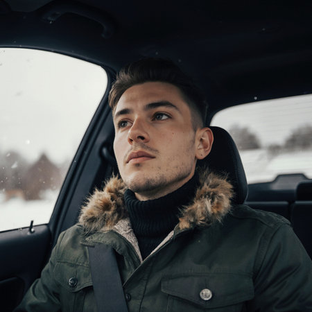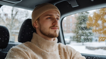 A young man in a cozy sweater enjoys a serene moment while driving through snowy scenery. His relaxed expression conveys joy and a love for winter drives.