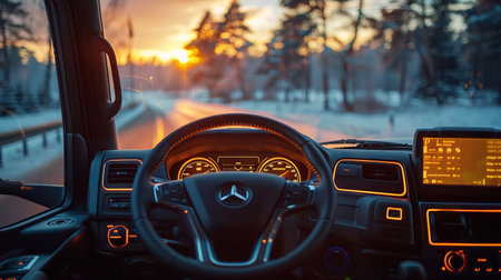 A car interior showing the dashboard and a view of a snowy road at sunset