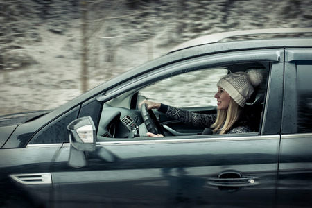 Woman driving a car in winter time.