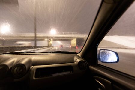 Image with motion blurred effect.Cars fast drive on the winter speedway or highway with roadway lighting in a snow storm in the twilight when snow with rain is flying. Concept of driving in the dangerous conditions with bad visibility on the winte