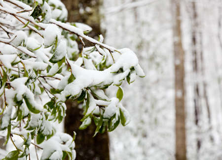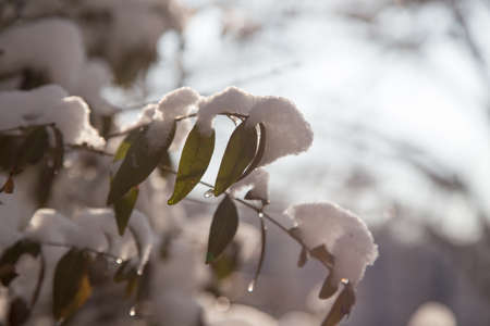 First snow falling gently on Pak wan tree leaves, a few snowflakes drifting slowly and settling on the leaves; fresh air, natural.