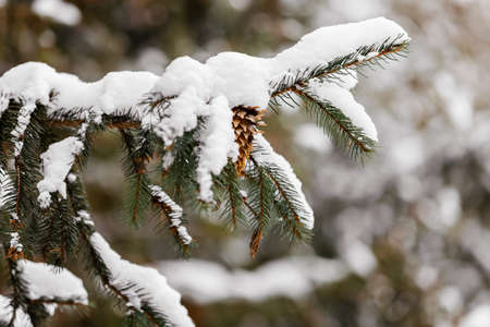 Branches and needles of spruce covered with snow in the winter forest. Nature