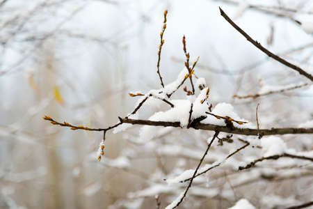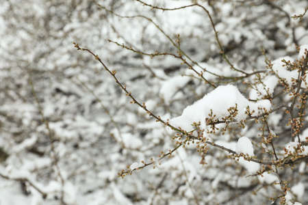 Snow covering branches of tree with flower buds. Unusual weather conditions in Paris, France