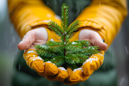 A person is standing and holding a small tree in their hands. The tree appears to be a young sapling with visible roots and branches. The individuals hands are cradling the tree carefully, showing a sense of nurturing and care towards the plant.