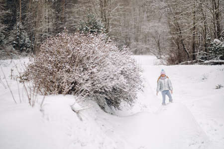 Young laughing happy Caucasian woman and pine branches in winter forest. Positive emotions, walking in snowy weather