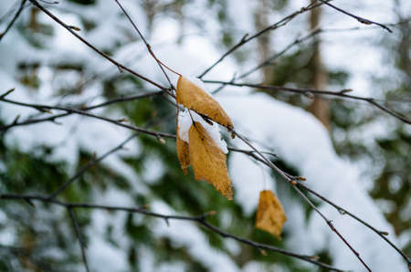 Beautiful branch with orange and yellow leaves in late fall or early winter under the snow