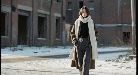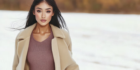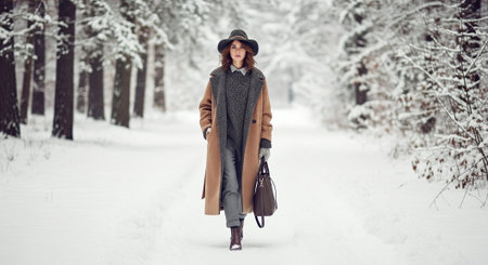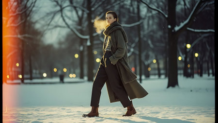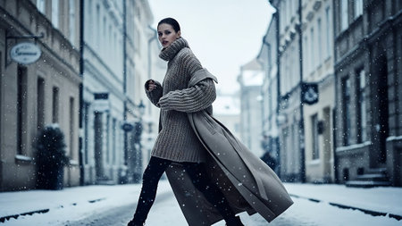 A model walks confidently in a snowy outdoor setting wearing a stylish beige coat and a warm sweater. The natural light enhances her features and the winter atmosphere creates a serene backdrop.