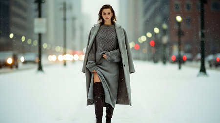 A fashionable woman walking in a snowy urban environment, wearing a stylish coat, scarf, and beanie, with snowflakes falling around her