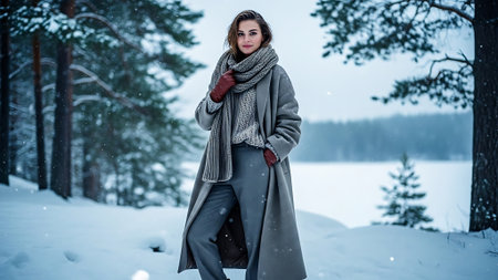 A poised woman dressed in a stylish winter coat poses against a snowy backdrop. Her hair flows with the wind, highlighting the serene beauty of winter while exuding elegance and style.