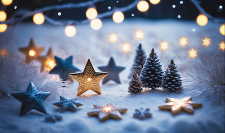 A close-up of several stars and small trees on a snowy surface with string lights in the background