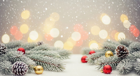 Festive Christmas scene with fir branches, ornaments, and lights.
