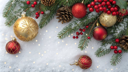 Festive Christmas ornaments, red gold baubles, pinecones, green branches on pristine white snow, evoking holiday spirit.