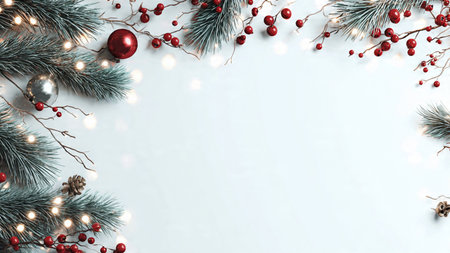A decorative layout featuring red ornaments pine branches and pinecones perfect for the winter holiday season backdrop.