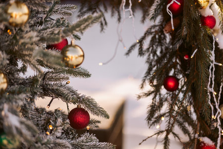 Christmas tree branches with red and garlands decorations and snow
