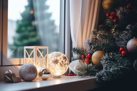 Christmas decor: silver and red Christmas decorations, pine branches on a wooden tray for morning breakfast by the window