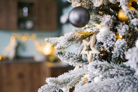 Home New Years interior. Christmas tree with gifts, decorated with garlands in the kitchen. Cozy atmosphere of a home holiday, loft design of the room, Scandinavian style.