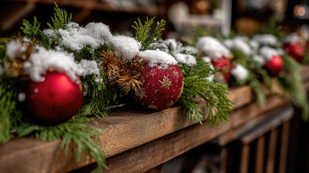 A beautiful arrangement of red ornaments dusted with snow, nestled among fresh evergreen foliage, set on a rustic wooden surface, perfect for holiday spirit.