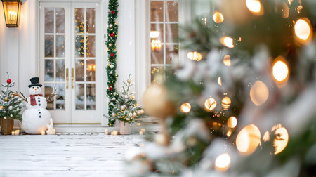 festive winter scene featuring snowman, decorated trees, and beautifully adorned entrance. atmosphere is warm and inviting, perfect for holiday season.