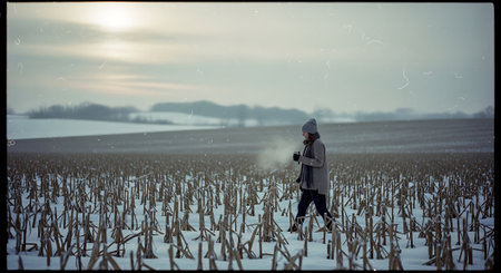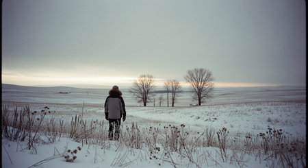 Sunrise or sunset in a winter field covered with snow and with trees and grass covered with frost. Vintage film aesthetic.