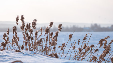dry ears of reed in the snow near the lake in winter. natural background, winter nature