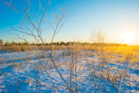 Beautiful winter landscape with dry grass covered with snow at sunset.