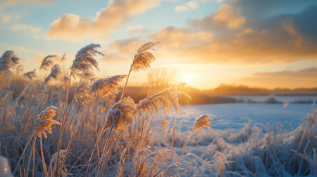 A close-up view of frosty grass covered in sparkling ice crystals illuminated by the warm light of sunrise, creating a beautiful winter scene in a snowy field.