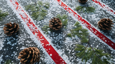 Winter scene featuring pine cones and evergreen branches on snowy surface, creating festive atmosphere. contrast of red and white adds cheerful touch to seasonal display