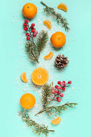 Christmas tree branch with red berries, pine cone and snowflakes. Turquoise background.