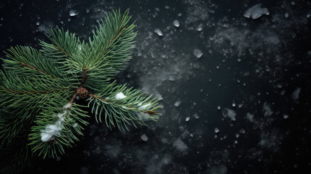 Christmas greeting card with fir tree branches covered with snow. Top view with copy space