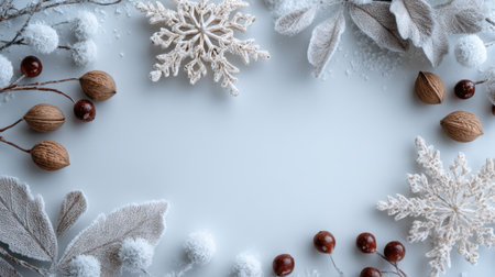 A serene winter-themed arrangement featuring delicate snowflakes, frosted leaves, and rich decorative berries, perfect for holiday projects or seasonal promotions.