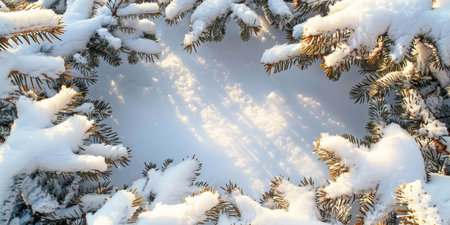 Winter Pine Branches Background Frame, Snow Covered Fir Border with Clean Copy Space