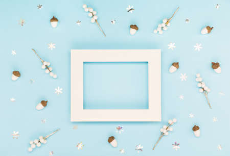 Christmas holiday winter New Year festive card. Xmas decorations, silver snowflakes, acorns on blue paper background. Flat lay, top view, copy space.