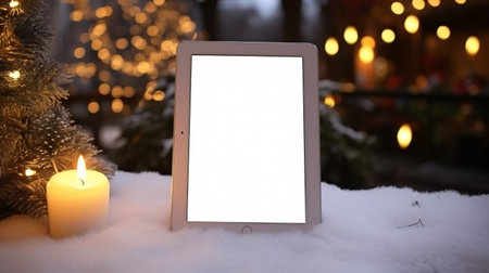 A photo frame mockup with an empty white canvas, placed on the floor beside Christmas decorations like lights and ornaments. The frame is made of light wood, adding warmth to its design. This scene creates a festive atmosphere for the New Year's celebration. --chaos 30 --ar 16:9 --v 6.1 Job ID: 9c8b223f-fc61-4810-9848-cd89ed9aa24b