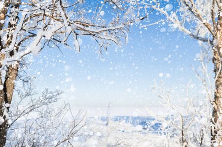 Winter background. Snow covered trees and snowfall. Beautiful winter landscape