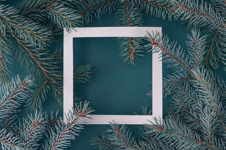 Composition of snowy Christmas tree branches with white frame on pastel blue background. Flat lay, top view, copy space.