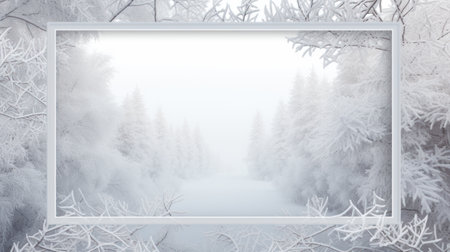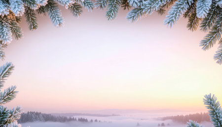 A beautiful arrangement of frosted evergreen branches creates a serene frame around a blank space, ideal for winter designs, holidays, and seasonal greetings.