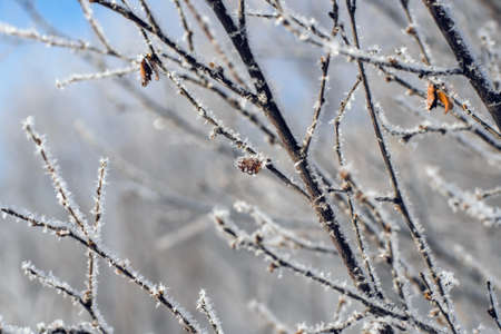 Close-up of beautiful tree branch in frost. Creative. Tree branch covered with frost. Winter frost on branches of tree on sunny day