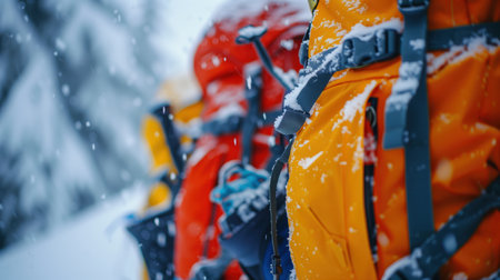 Close-up of vibrant snowkiting gear with orange and red backpacks, highlighting outdoor winter sports and adventure in snowy conditions.