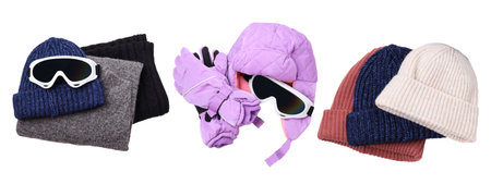 Winter hats, gloves, and goggles in varied colors, isolated, PNG