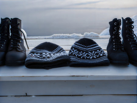 Detailed close-up shot of cozy knitwear, warm boots, and stylish hats. Perfect for fall or winter fashion.