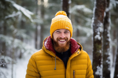 A handsome red-haired young man in a knitted yellow hat walks and smiles in a snowy winter forest. Happy guy's face portrait close-up front view. Generative AI. Outdoor activities concept.