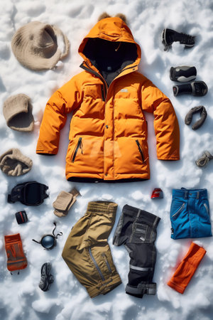 Top-down view of snow suit and winter gear neatly arranged on white snow with snowflakes falling