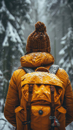 Hiker walking in snowy winter forest with backpack.