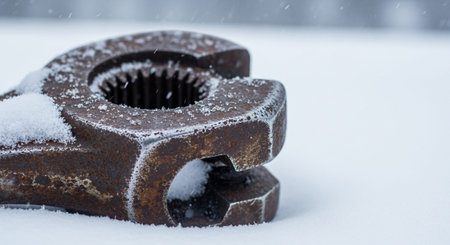 A detailed close-up shot focuses on a weathered, rusty metal industrial component resting in soft, white snow. The intricate details of the including a toothed inner mechanism resembling a gear or cog, are clearly visible beneath a delicate dusting of snow. The rough, textured surface of the metal signs of age and corrosion, with rich brown and orange hues contrasting with the pristine white of the snow. The background is a soft blur of white, emphasizing the isolation and texture of the...
