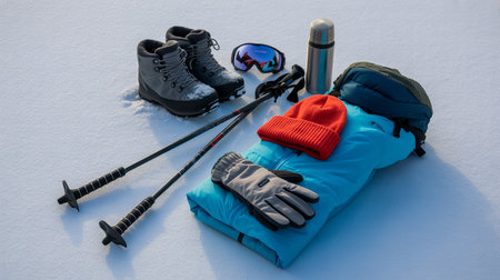 Winter hiking gear with boots poles sleeping bag and accessories on snow