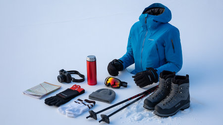Winter hiking gear perfectly arranged, Organized collection of cold weather hiking equipment, Neatly organized display of musthave equipment for cold weather backcountry adventures