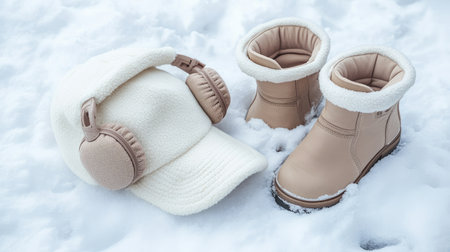 Cozy winter accessories including a hat, headphones, and boots placed on fresh snow create a serene and stylish seasonal scene. Perfect for cold weather.