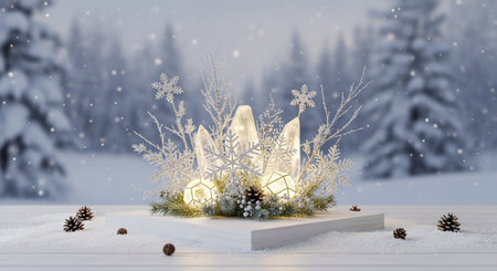 3d rendering of christmas decoration on white wooden podium in snowy forest